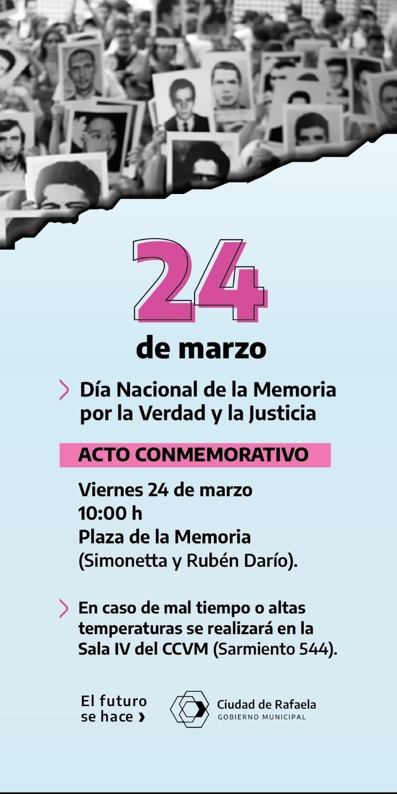 Por dicho motivo, la Municipalidad de Rafaela llevará adelante el acto oficial a desarrollarse el próximo viernes 24, a las 10:00 de la mañana, en la Plaza de la Memoria, ubicada en barrio Villa Podio (Simonetta y Rubén Darío). En caso de mal tiempo o altas temperaturas, se realizará en la Sala IV del Centro Cultural Viejo Mercado (Sarmiento 544).
