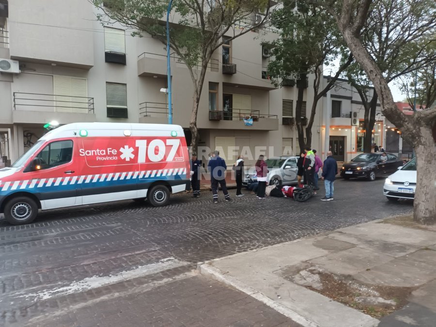 Alrededor de las 18:00 horas, Rafaela Noticias fue testigo de dos accidentes ocurridos en la misma cuadra y casi al mismo tiempo. El primero se registró en la intersección de Bv. Yrigoyen y calle Vélez Sarsfield, donde una motociclista cayó al suelo al intentar frenar debido a lo resbaladizo de los adoquines. Fue asistida por el Servicio de Emergencias 107.