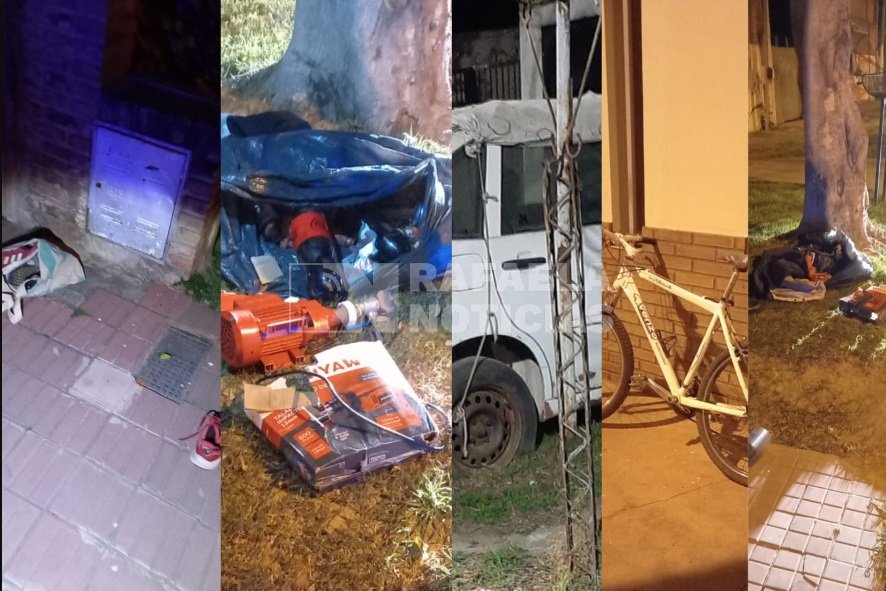 Mientras tanto, en el lote baldío ubicado al sur del domicilio en la calle Victor Manuel al 700, se encontraron unas zapatillas, una garrafa y una linga para autos, que aparentemente estaban listas para ser robadas. Además, en la intersección de las calles Victor Manuel y O Higgins, se encontraron una bicicleta marca Venzo de color blanca, una gorra y unos lentes tirados.