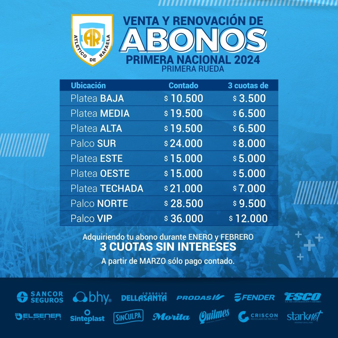 El Consejo Directivo de Atlético informa que a partir de este martes 16 de enero, en la secretaría administrativa «Julio Litvak», se pondrán a la venta los Abonos de Plateas y Palcos del Estadio Monumental para la primera rueda de la temporada 2024 de la Primera Nacional, la cual consta de nueve partidos en barrio Alberdi.