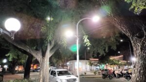 Por lo que se pudo ver, se colocaron columnas tradicionales,aunque mucho más bajas que la ubicas en el entorno exterior de la plaza.. Las mismas están ubicadas en la misma línea de las tipas que forman el arbolado del contorno del paseo, pero además de tener un brazo hacia la calle interna de la 25 de Mayo tienen también un brazo más bajo direccionado a la vereda. Al tener instaladas luminarias led, mucho más potentes y con menos consumo eléctrico que las luminarias tradicionales, la mejora que se nota en la iluminación, al menos en el sector donde ya se instalaron las luces, es muy notoria