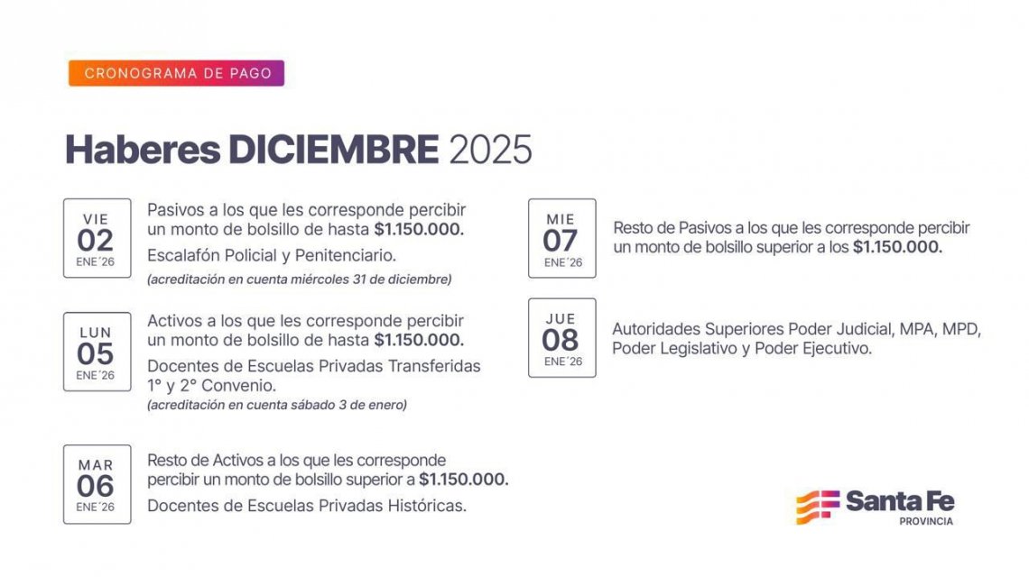 El Gobierno Provincial, a través del Ministerio de Economía, informó que los haberes del mes de diciembre se percibirán a partir del viernes 2 de enero, con un cronograma que concluirá el jueves 8.