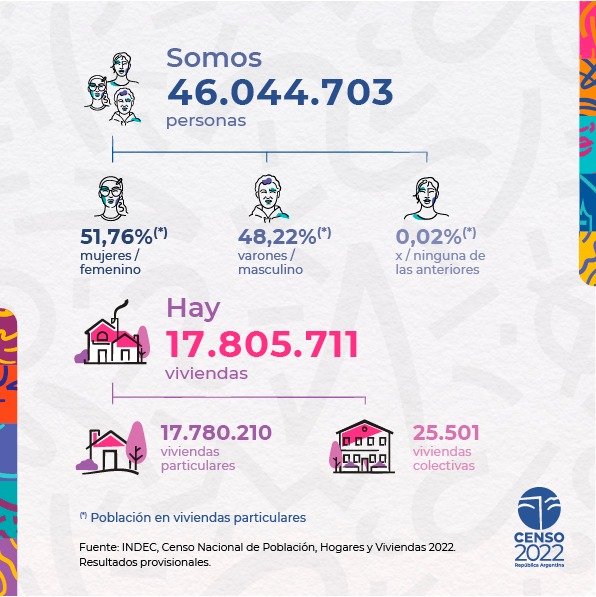 En Argentina viven 46.044.703 habitantes. Es el primer dato que se desprende de la divulgación este martes a la tarde por parte del Instituto Nacional de Estadísticas y Censos (Indec) de los datos del Censo 2022, realizado el 18 de mayo de 2022. Según el mismo informe, en Santa Fe hay 3.556.522 habitantes, y en el departamento Castellanos la población censada fue de 192.517 habitantes.
