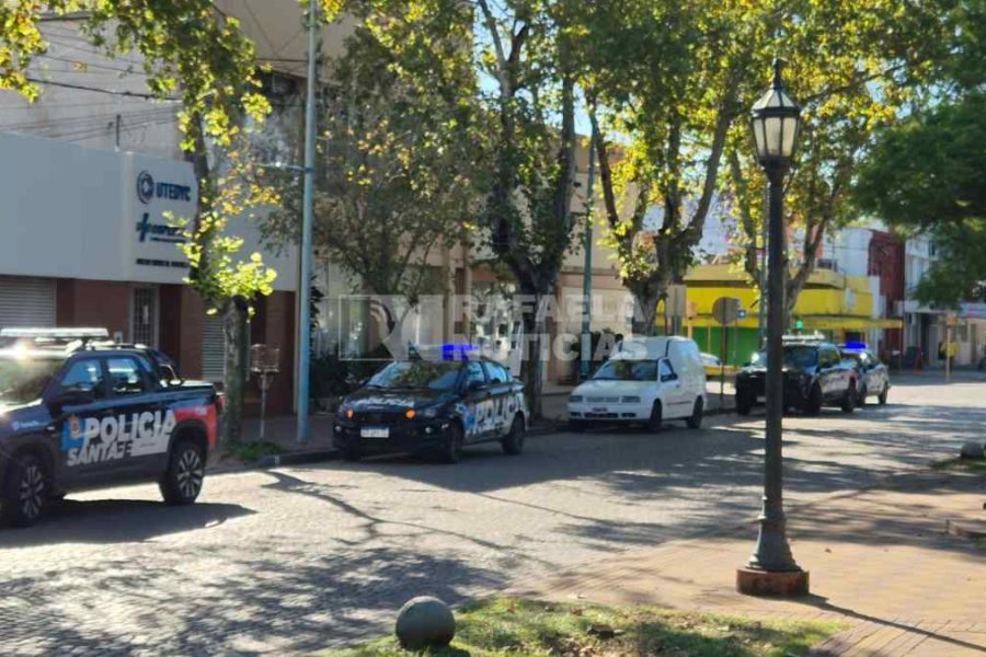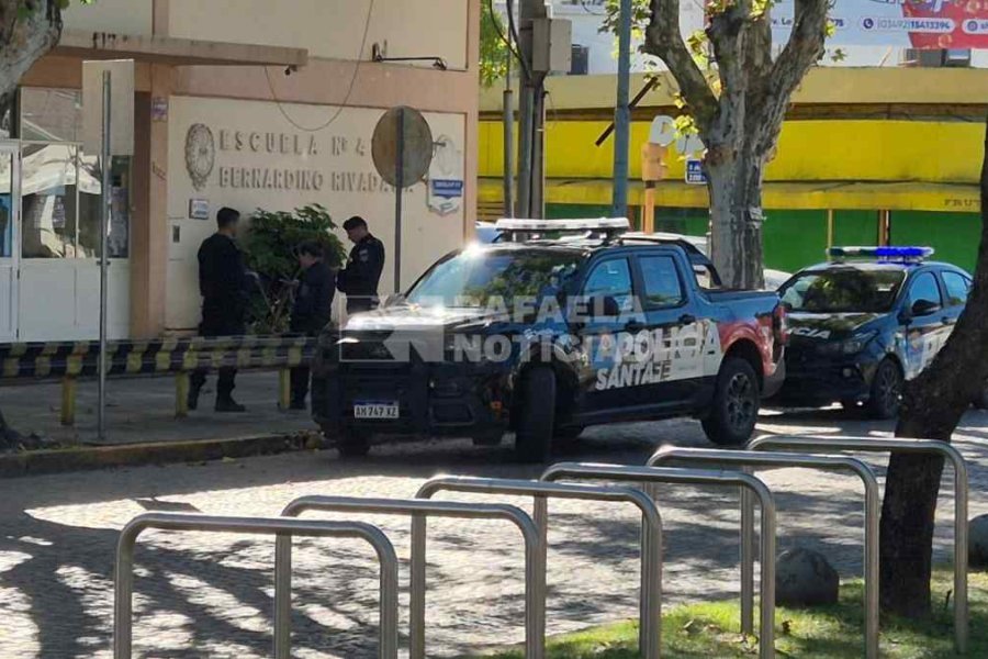Un fuerte despliegue se desarrolla en la Escuela Rivadavia de Rafaela, donde trabajan 4 patrulleros. La directora activa el protocolo de intervención tras divisar un arma dentro de la mochila de un alumno que asiste al establecimiento. Las autoridades policiales confirman en el lugar que el elemento secuestrado es un arma de juguete.