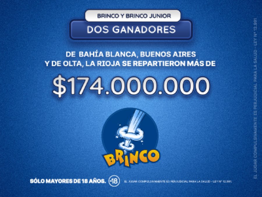 Lotería de Santa Fe les informa que durante el último sorteo de Brinco fueron dos los afortunados apostadores que se repartieron más de  $174 millones. El primero de ellos se adjudicó el pozo total del Brinco Tradicional llevandose  $150 millones acertando los 6 números que fueron 06-10-12-26   -27-37 e hizo su apuesta en la localidad de Bahía Blanca, provincia de Buenos Aires.