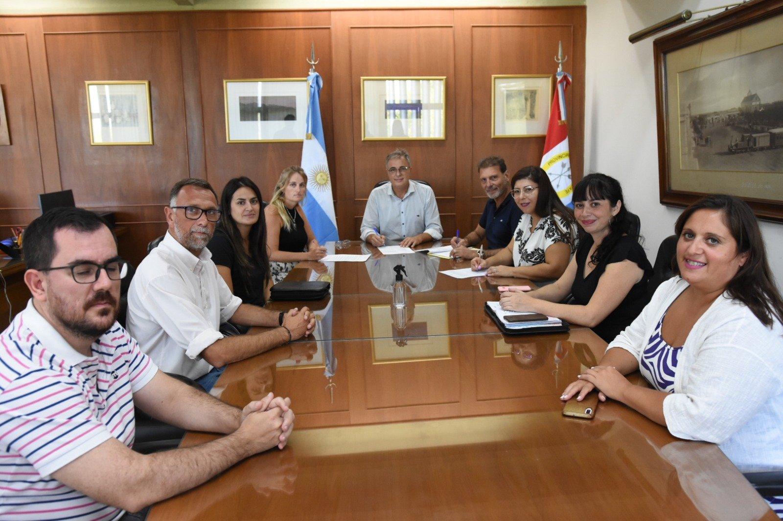 Del encuentro formaron parte las secretarias de Desarrollo Humano, Myriam Villafañe; de Auditoria, Evaluación y Transparencia, Cecilia Gallardo; de Hacienda y Finanzas, Noelia Chiappero; el secretario Producción, Empleo e Innovación, Diego Peiretti; las secretarias Adjunta del SEOM, Anahí Raffaelli; la Gremial, Eloísa Torreano; y el secretario de Turismo y Deportes, Hernán Bo.