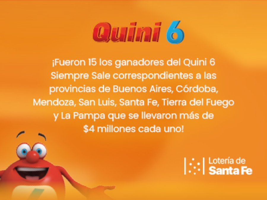 Anoche, durante el sorteo de Quini 6 se registraron 15 ganadores con 5 aciertos en la modalidad Siempre Sale quienes se repartieron más de $62 millones con los números 08 – 09 – 15 – 28 – 36 44.