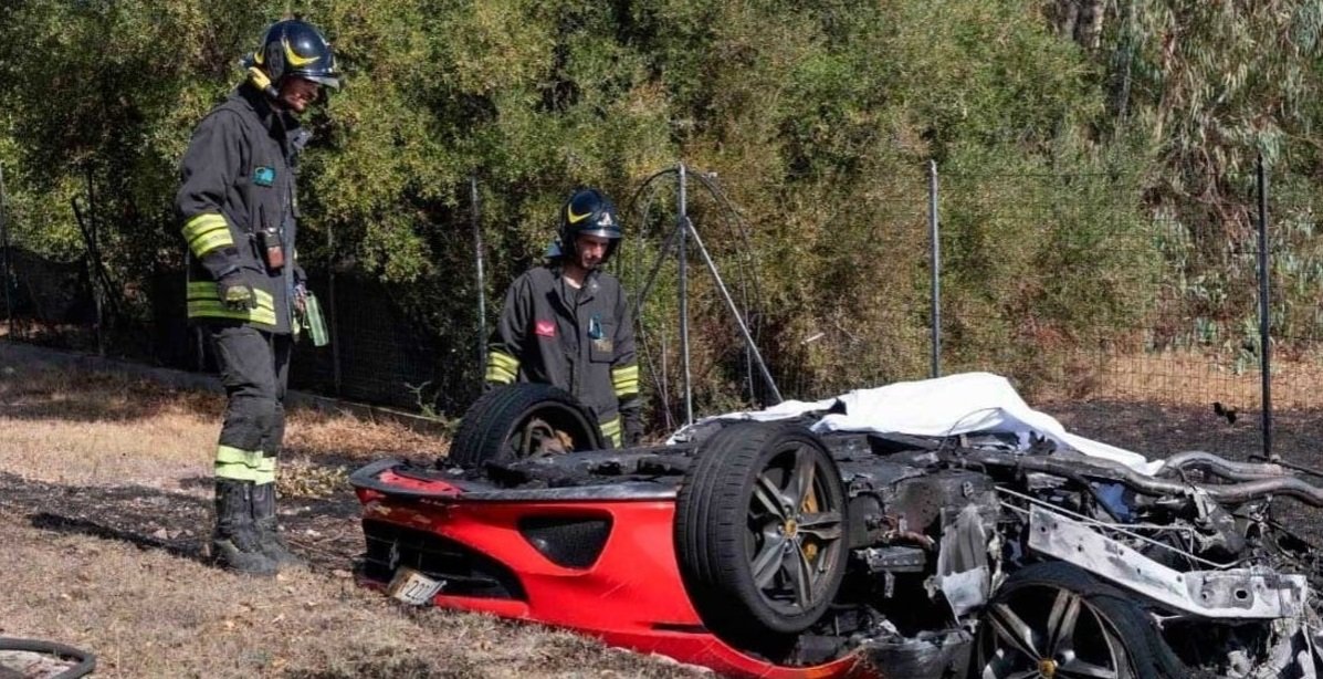 El Lamborghini acabó fuera de la calzada, en el lado derecho, mientras que el Ferrari volcó sobre sí mismo en el otro lado de la carretera donde se incendió, atrapando a sus dos ocupantes en le interior.