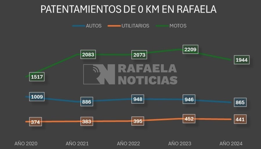 Durante todo el 2024, en Rafaela se patentaron 3.271 vehículos cero kilómetros, desglosados en 865 autos, 441 utilitarios y 1.944 motos. Además, se registraron 1 colectivo y 20 acoplados o semirremolques. Este número general es el segundo más bajo desde la pandemia, en 2020, cuando en la ciudad se habían patentado 2.932 vehículos.