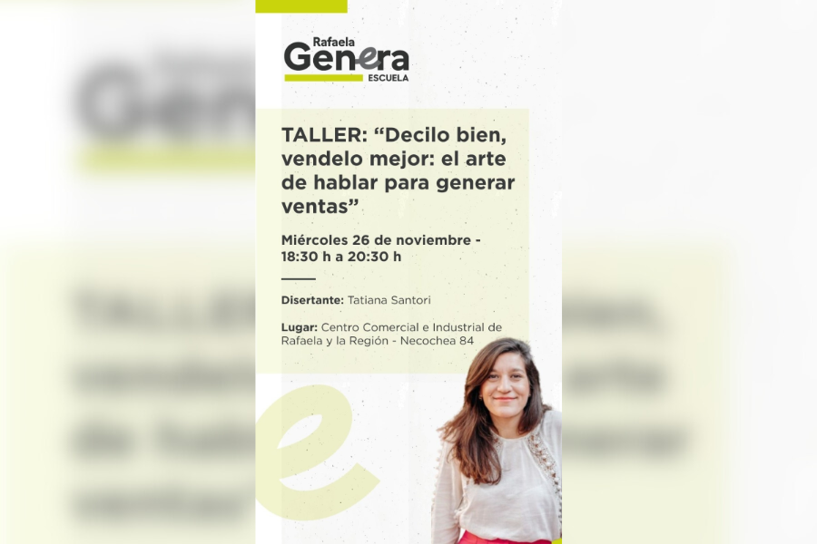 El miércoles 26 de noviembre se llevará a cabo el taller “Decilo bien, vendelo mejor: el arte de hablar para generar ventas”, a cargo de Tatiana Santori, en el marco de Rafaela Genera – Escuela.