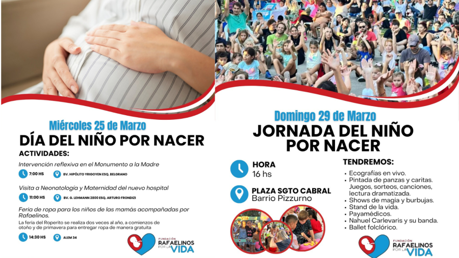 El cierre del Mes de la Vida será el domingo 29 de marzo con la Jornada del Niño por Nacer, a partir de las 16:00 en la Plaza Sgto. Cabral (Barrio Pizzurno). La propuesta incluirá actividades para toda la familia: ecografías en vivo, pintada de panzas y caritas, juegos, sorteos, espectáculos musicales, lectura dramatizada, shows de magia y burbujas, un stand informativo y la participación de payamédicos. Además, se presentarán Nahuel Carlevaris y su banda, junto a un ballet folclórico.