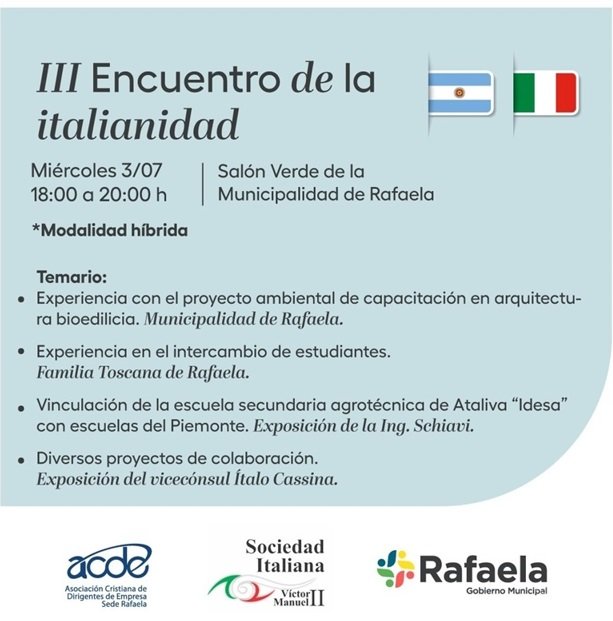 Cabe destacar que este encuentro es organizado por la Asociación cristiana de dirigentes de empresa sede Rafaela, la Sociedad italiana y el Gobierno Municipal. Su participación es fundamental para continuar construyendo puentes de cooperación y desarrollo.