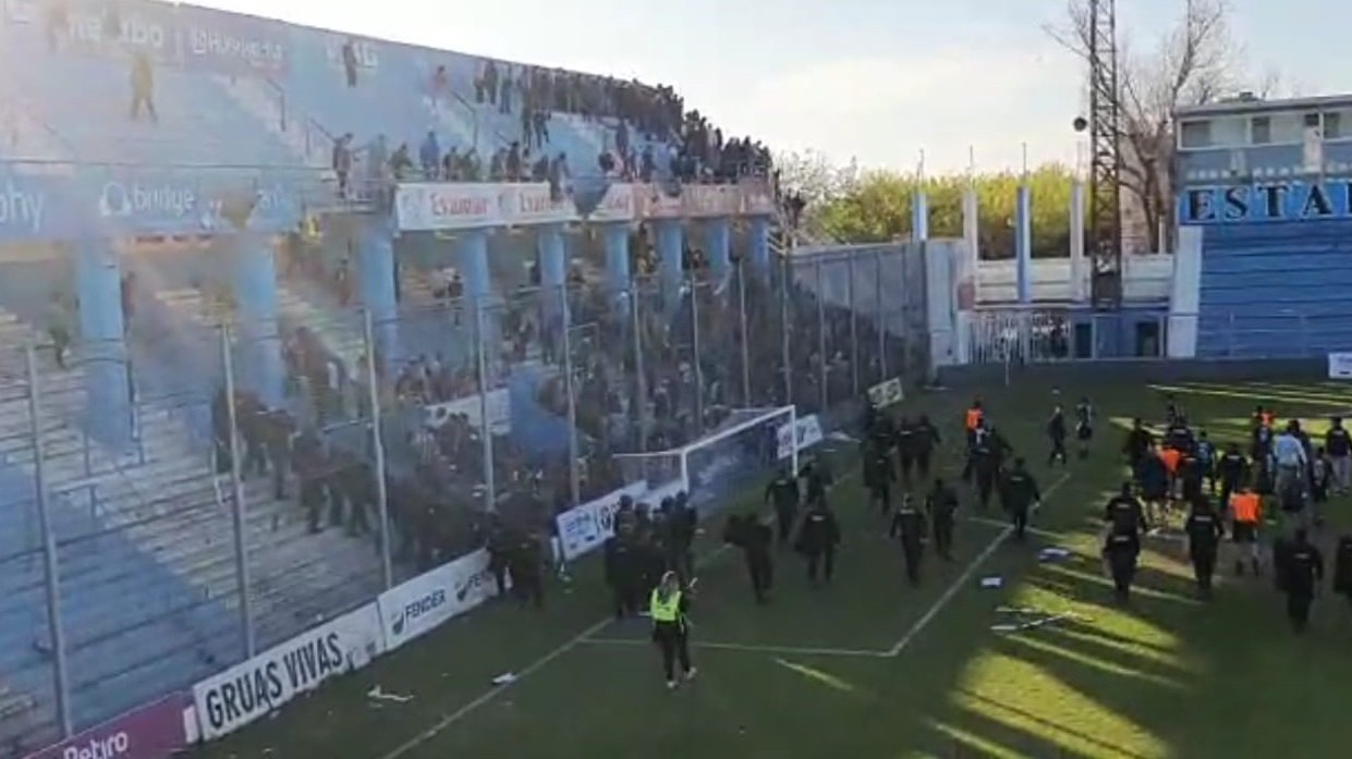 Cuando el jugador visitante fue intentar enfrentarlos, un policía lo habría intentado bajar del alambrado utilizando su bastón y fue golpeado por el futbolista sportivense. Allí se generó una primera trifulca entre jugadores, integrantes del cuerpo técnico y jugadores. Las corridas y las agresiones enardecieron a algunos integrantes de la parcialidad visitante. Al menos tres personas comenzaron a arrojar los asientos plásticos de las plateas altas de calle Urquiza sobre el cordón de policías que separaba a la popular visitante de los palcos, donde otros sujetos hacían gestos obscenos a la parcialidad de Sportivo.