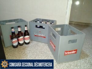 tenían consigo un cajón de cervezas, con doce botellas selladas de esa bebida. Se trataba de dos individuos de 24 y 28 años, que habían sustraído esos elementos desde una distribuidora ubicada a 100 metros.