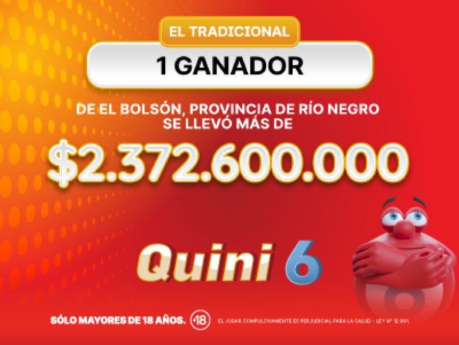 Apenas comenzó el sorteo de Quini 6 de esta noche un afortunado apostador se hizo acreedor al primer premio con seis aciertos del «Tradicional Primer Sorteo» con un premio de más de $2.372.600.000. El feliz ganador hizo su apuesta en la localidad de El Bolsón provincia de Río Negro y acertó los siguientes números 11-29-36-39-42-43.