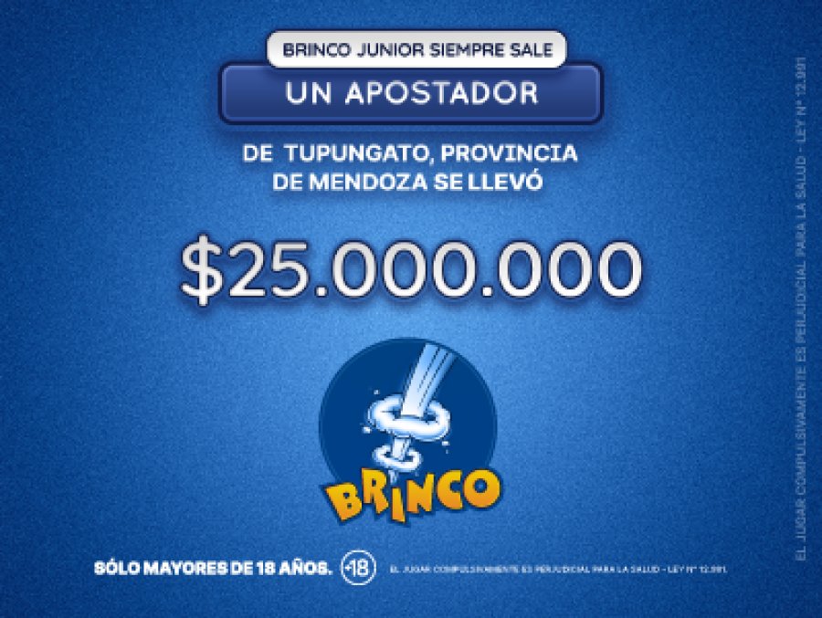 En el sorteo de Brinco de esta noche un feliz apostador se adjudicó la suma de $25 millones en el Brinco Junior con una jugada realizada en la localidad de Tupungato, provincia de Mendoza.